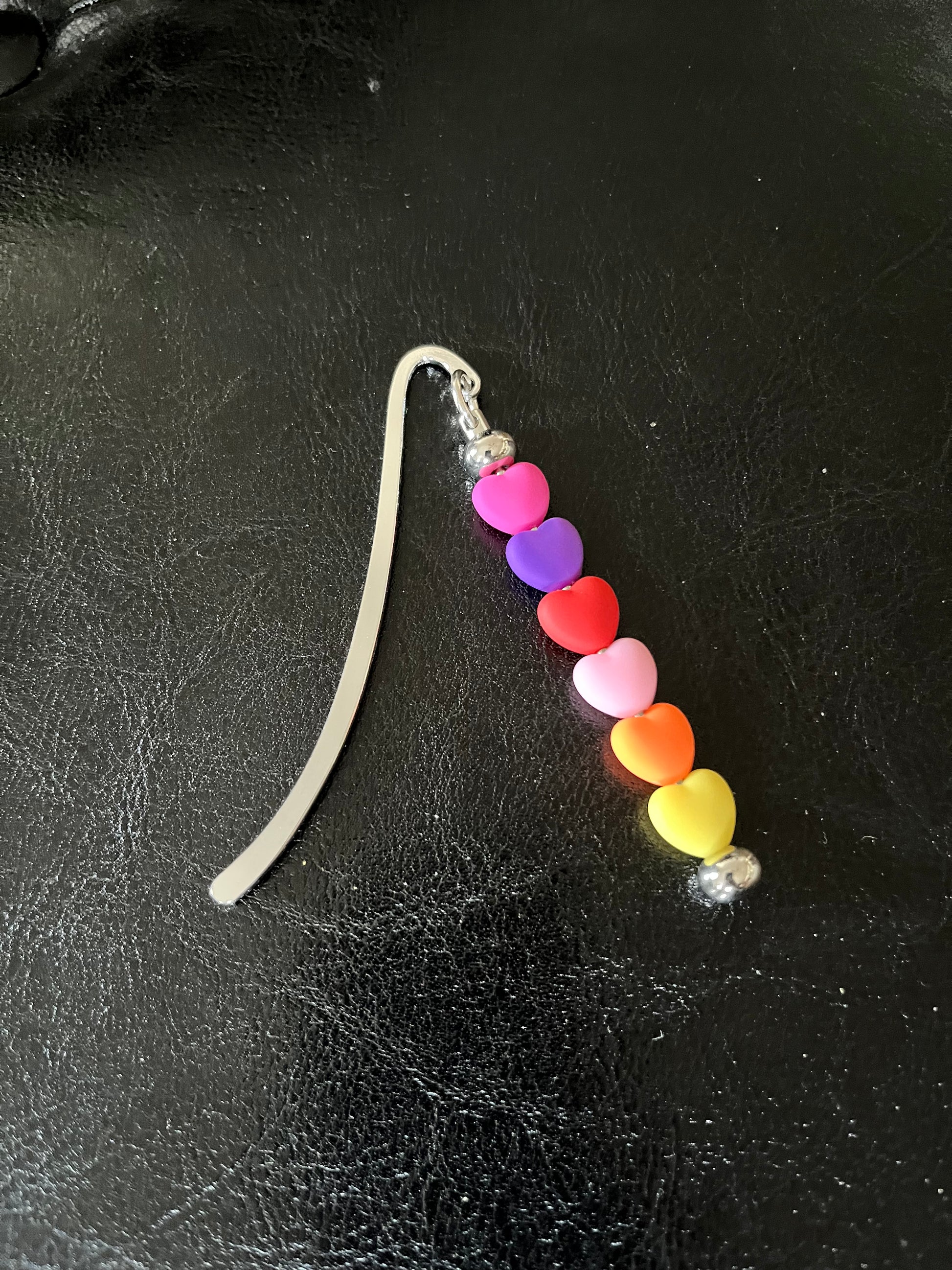 This bookmark has 6 silicone heart beads in different colors