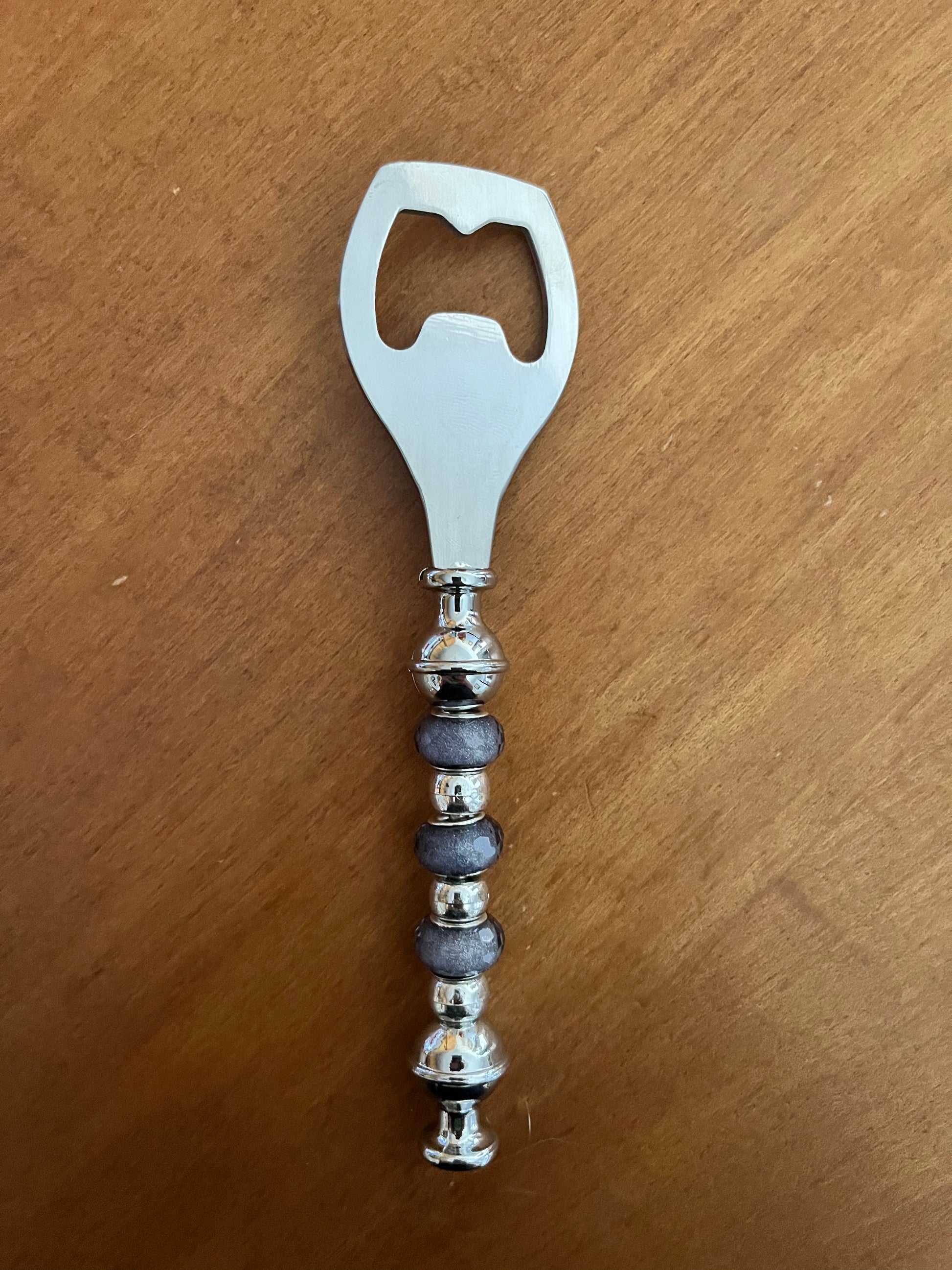 This is a silver bottle opener with silver beads and gray glitter beads.