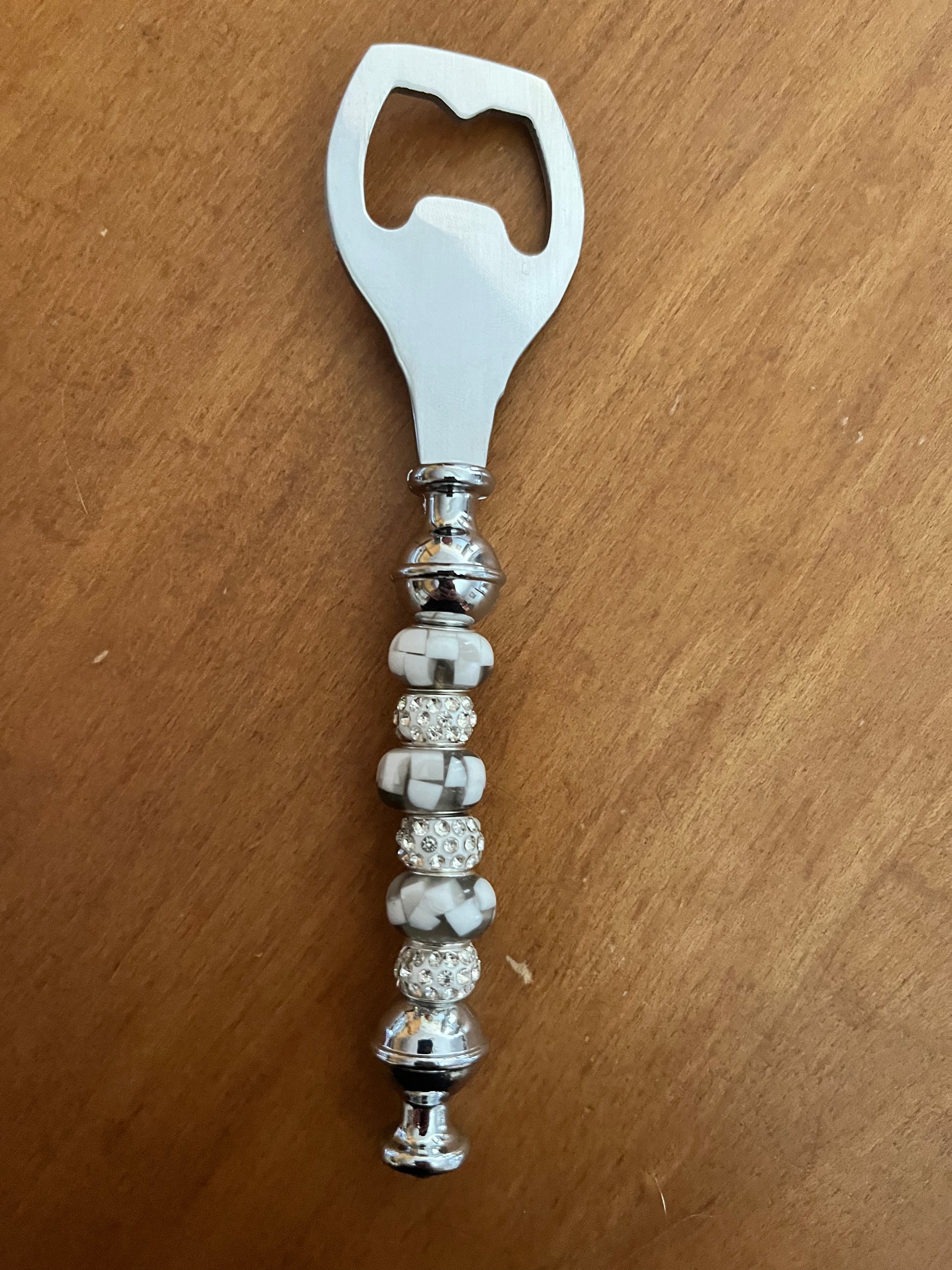 This is a silver bottle opener that has gray and white marble beads and silver rhinestone beads.