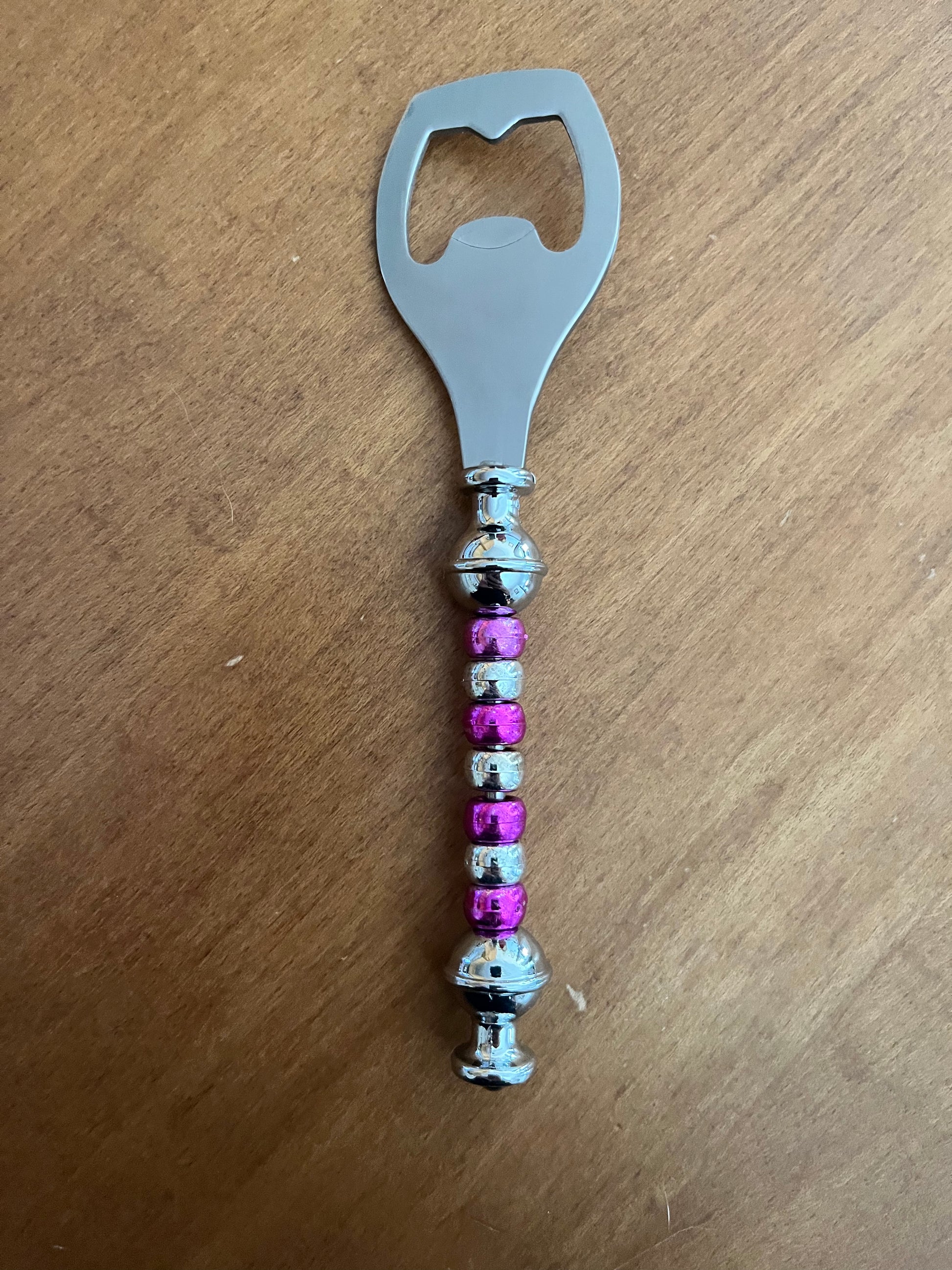This is a silver bottle opener with pink and silver beads.