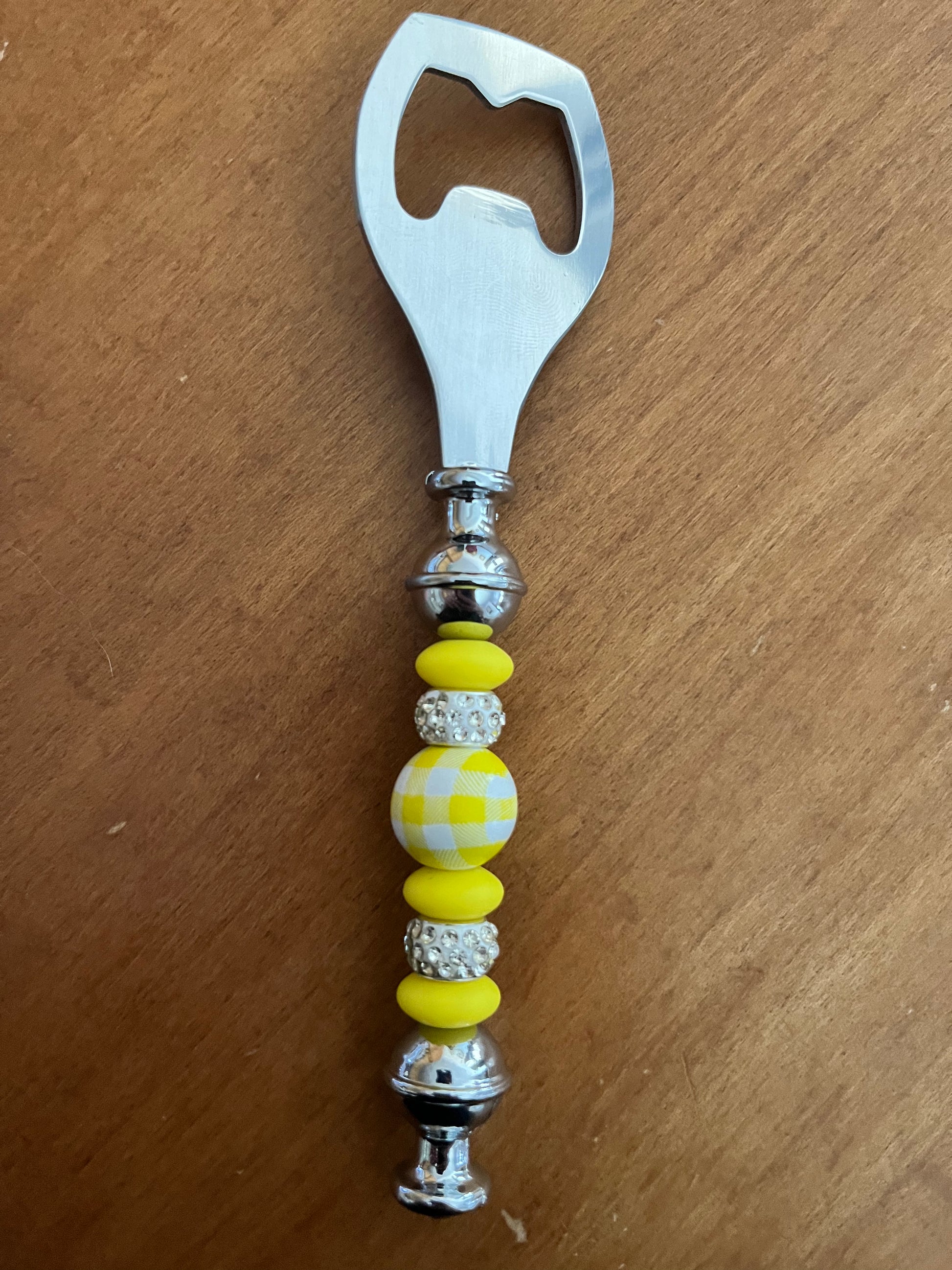 This is a silver bottle opener and it has a yellow and white checkered bead in the middle. It has three yellow beads and two silver rhinestone beads.