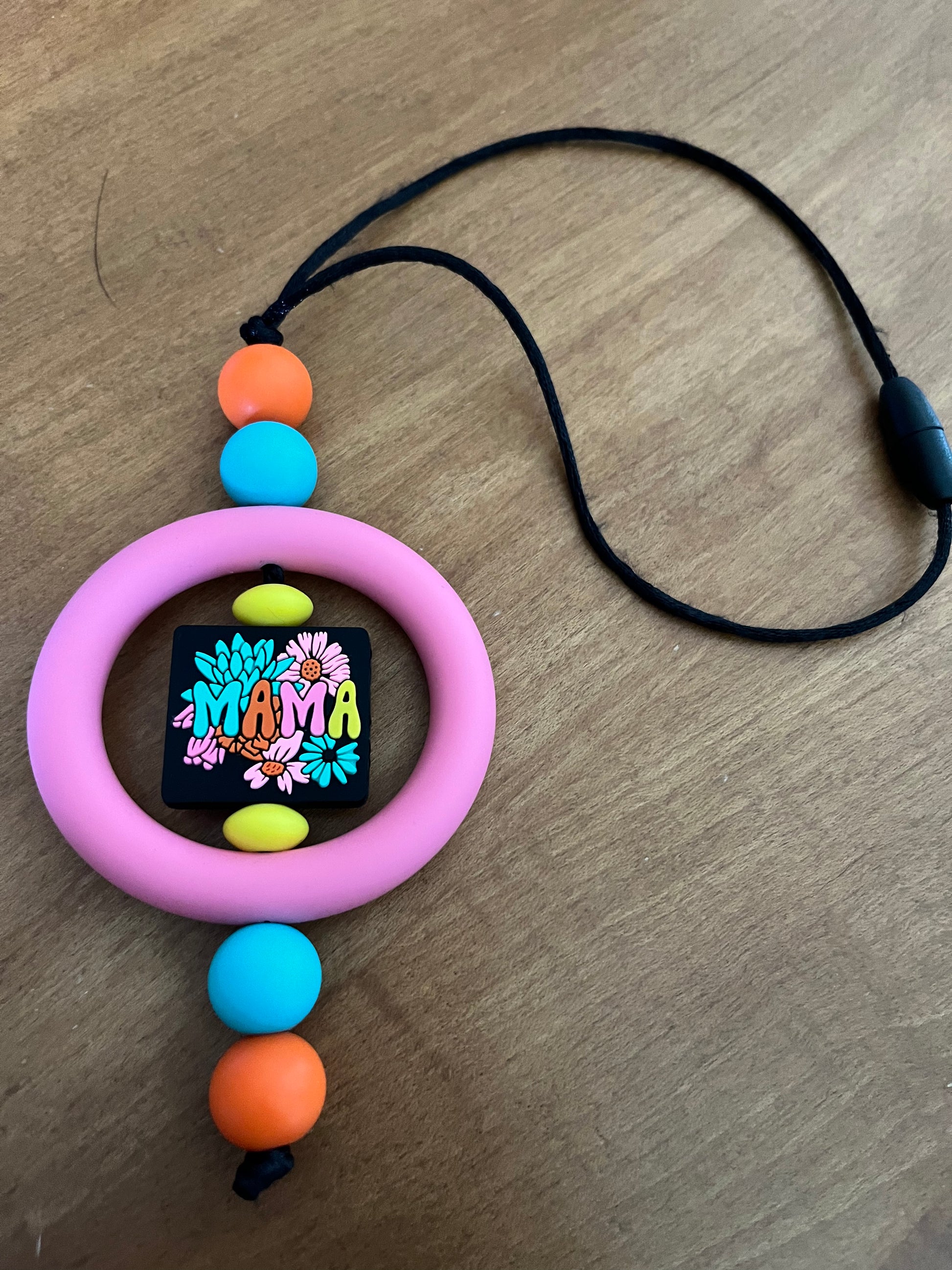 This car charm is on a black cord, it has a pink silicone ring, orange, teal and yellow silicone beads. The focal bead reads "MAMA" in teal, orange, pink and yellow letters.