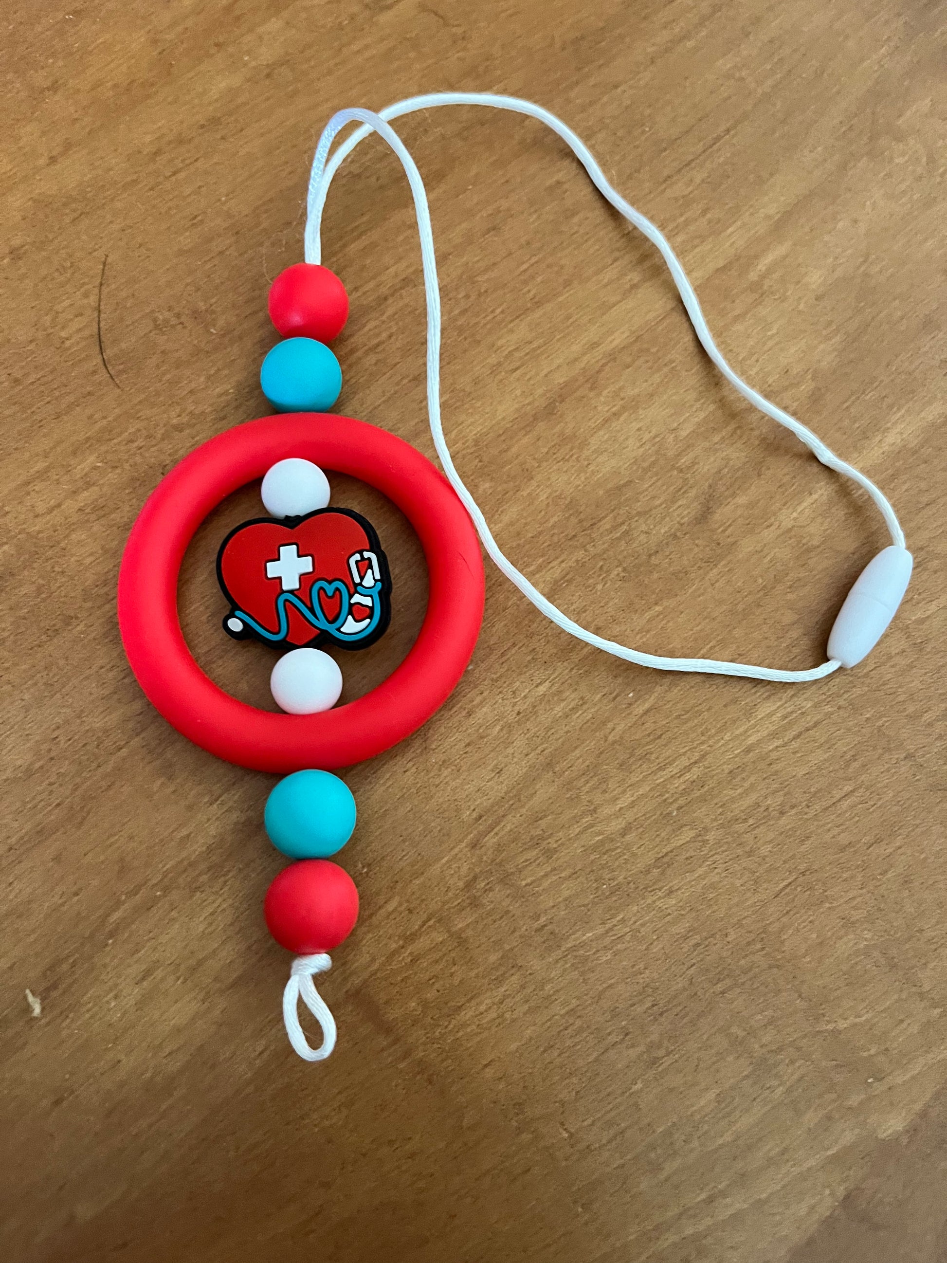 This car charm is on white cord, it has a red silicone ring and red, white and teal (Blue) silicone beads. The focal bead is a heart with a stethoscope.