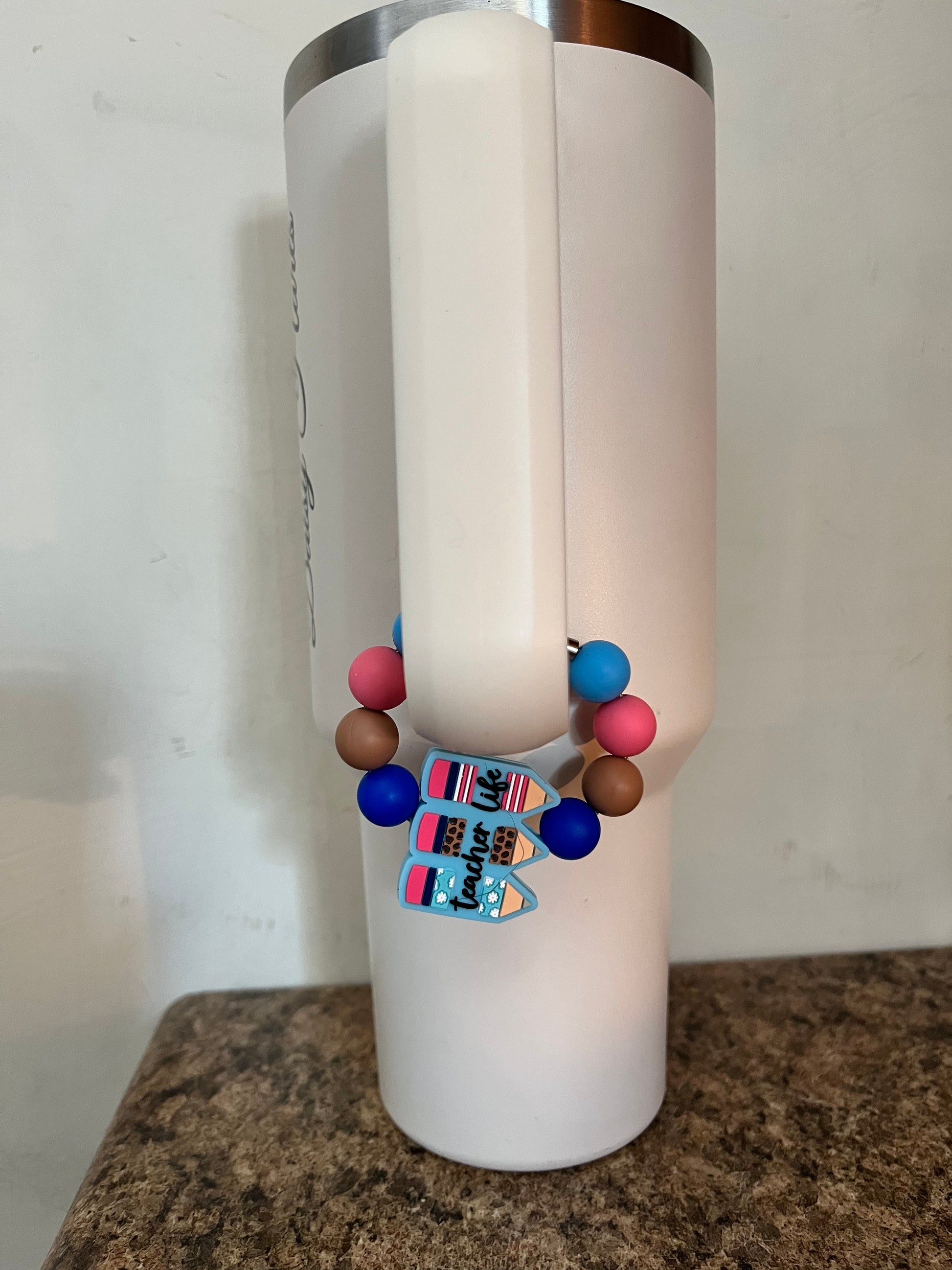 Pink, blue, brown focal bead with "Teacher Life" written on it with pink, blue, brown and white silicone beads.
