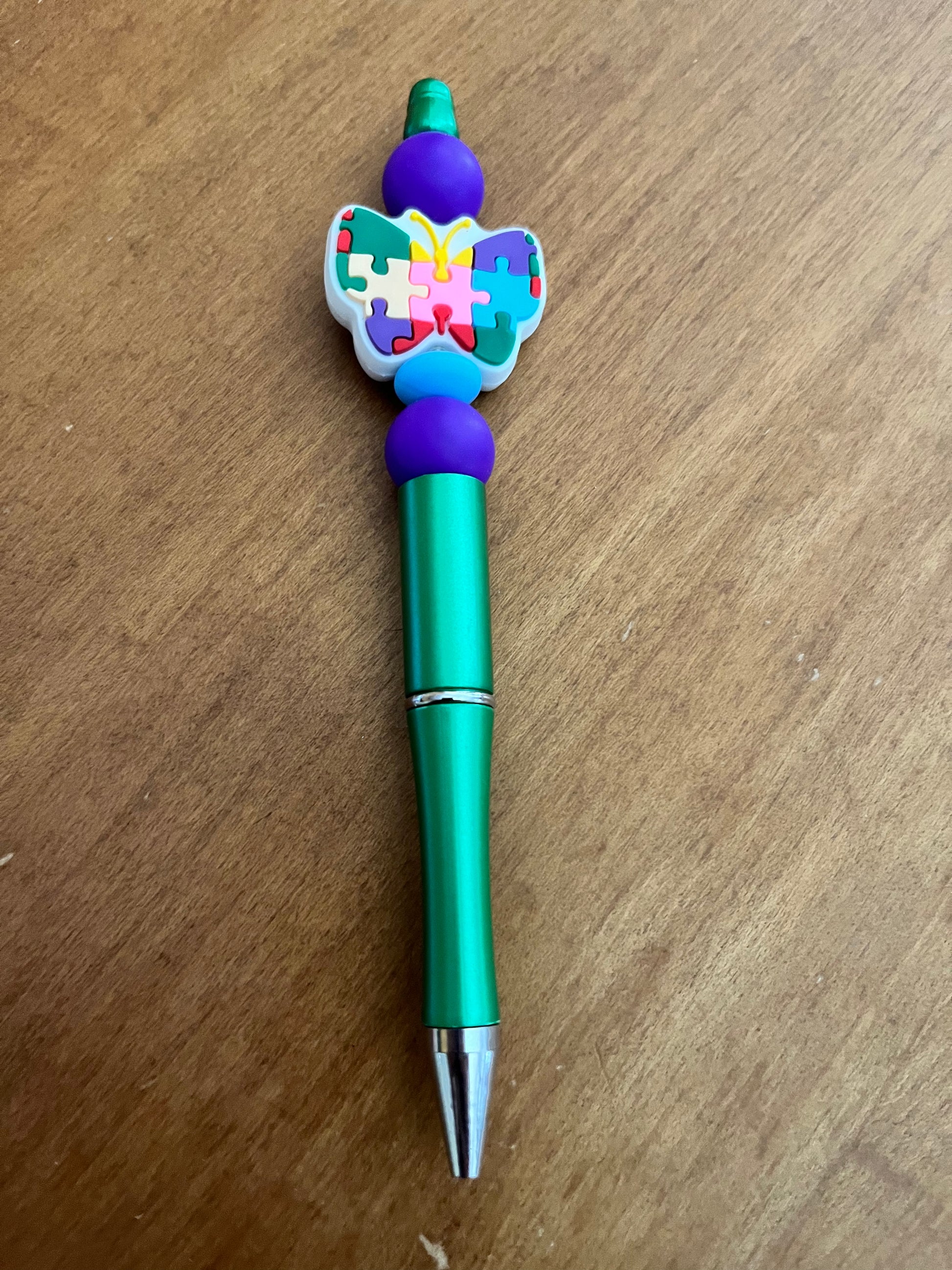 This pen is green and has blue and purple silicone beads. The focal bead is a butterfly with different colored puzzle pieces inside. The ink is black.