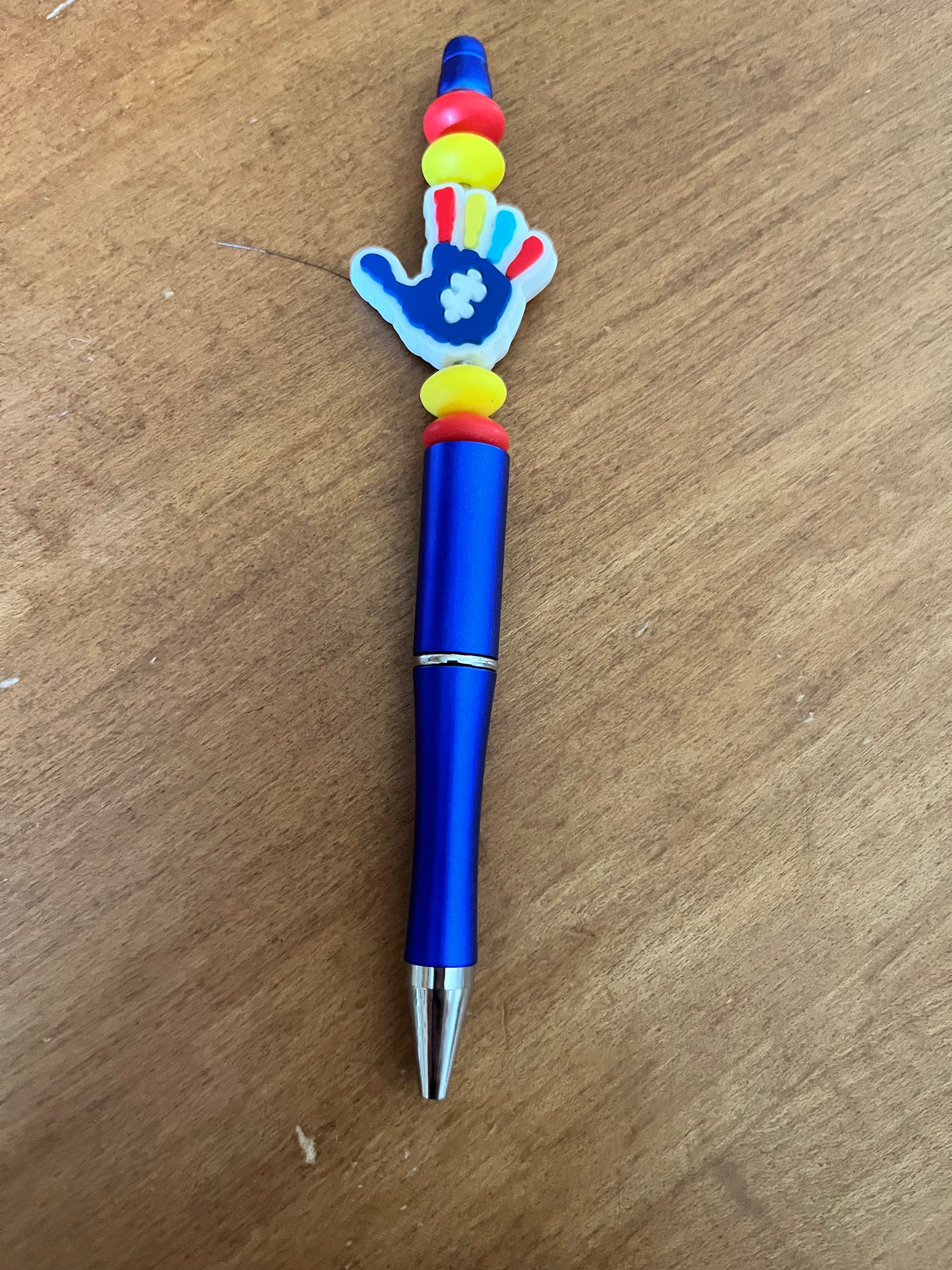 This pen is blue with yellow and red silicone beads. The focal bead is a hand with the autism colors. The ink is black.