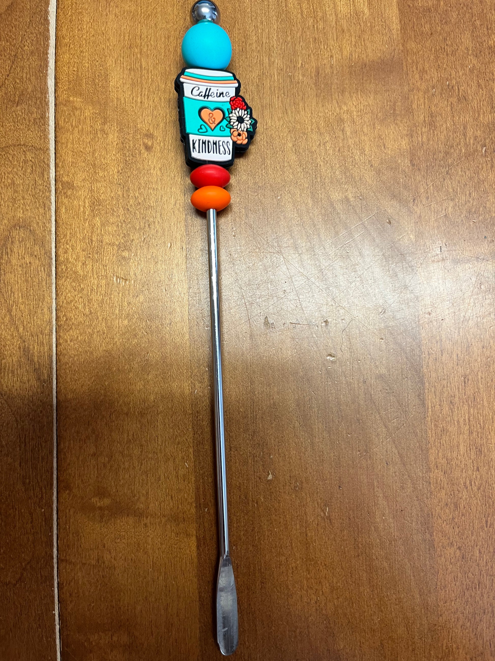 Stirrer with a focal bead that reads "Caffeine & Kindness". Turquoise silicone bead, orange and red lentil beads.